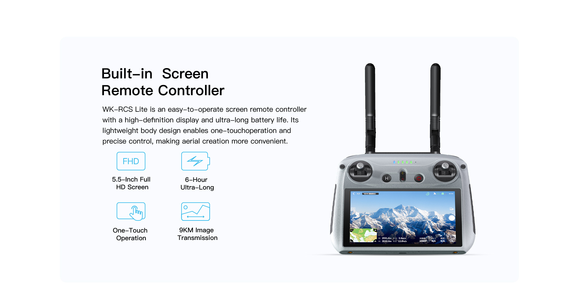 MINI X is a lightweight foldable quadcopter aerial drone equipped with a self-developed brushless motor. It is compatible with multiple expansion interfaces and different version configurations. Paired with the WK-RCS Lite remote controller, it’s ready to fly right out of the box with a 32-minute long flight time, making aerial photography more hassle-free.