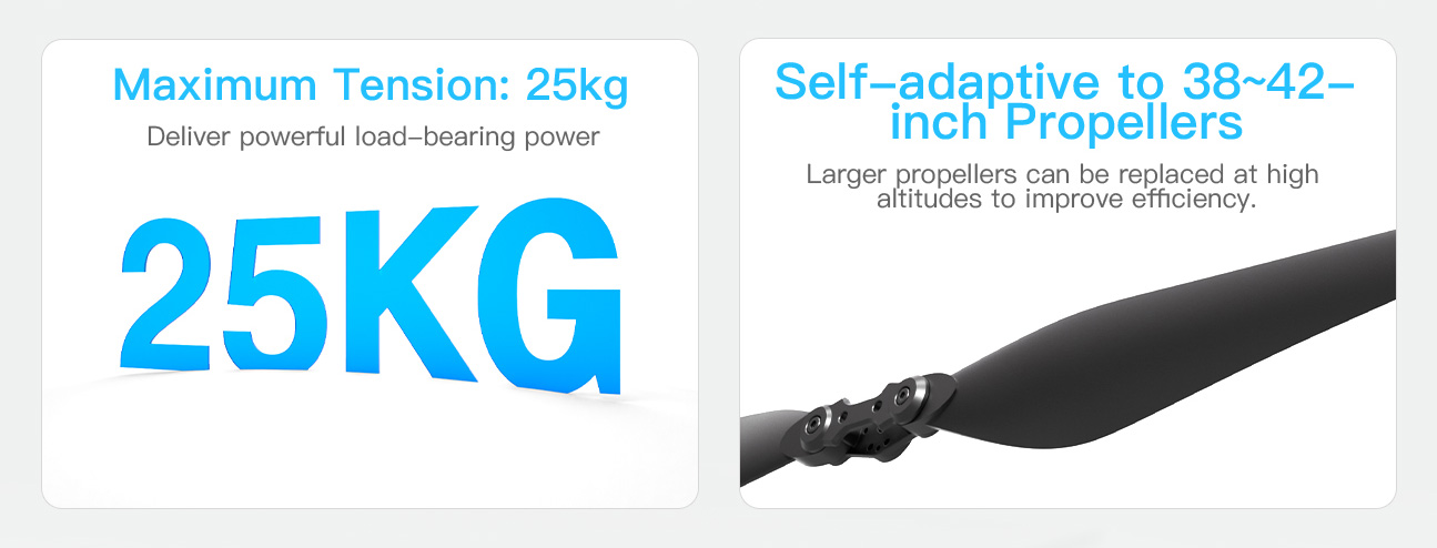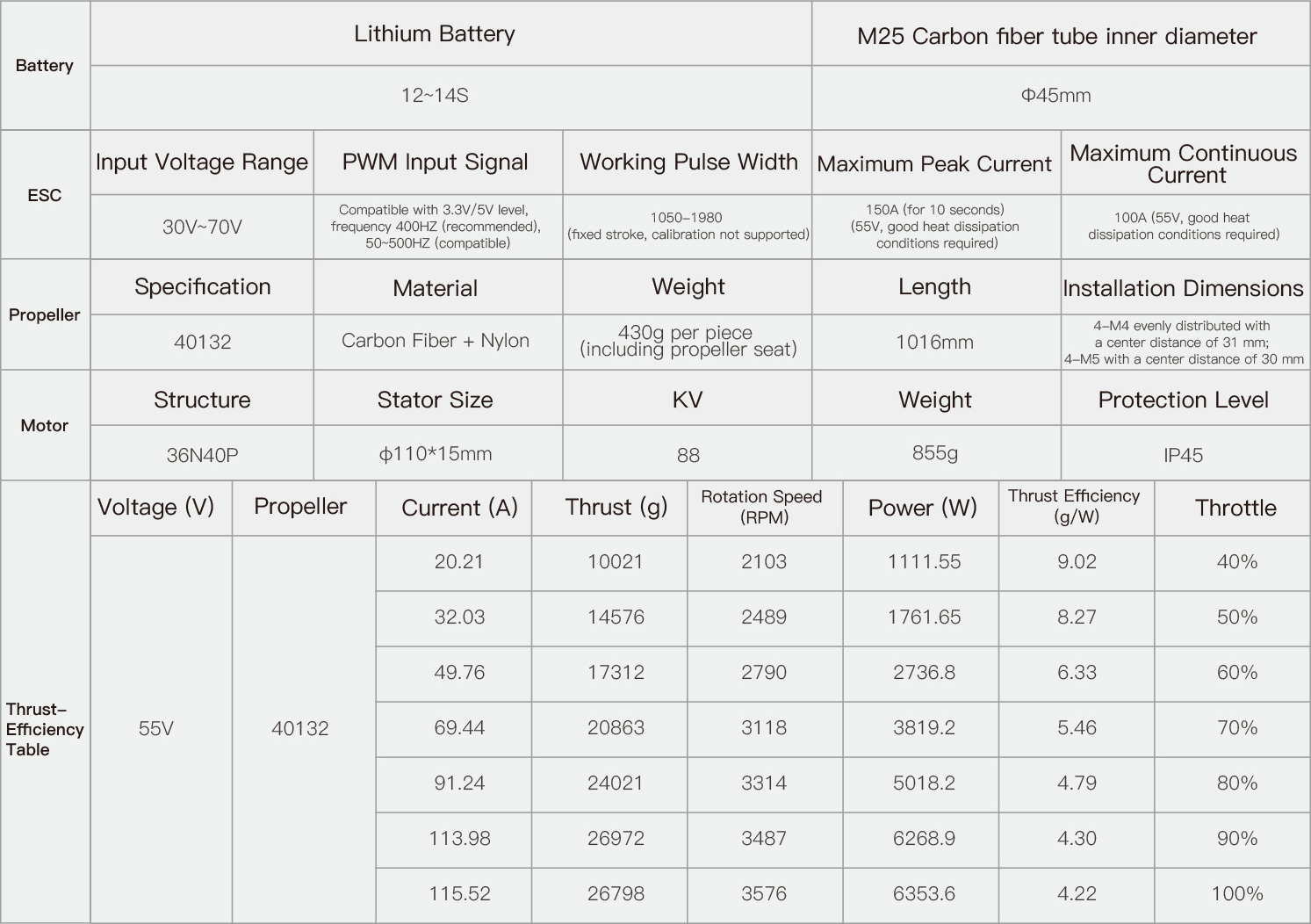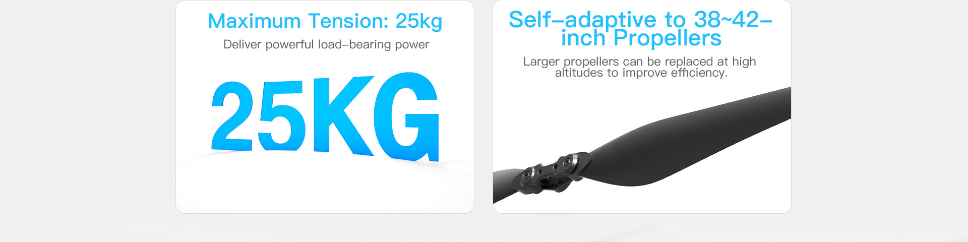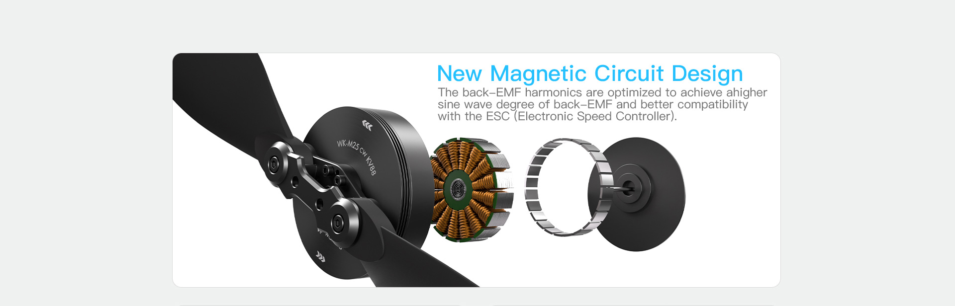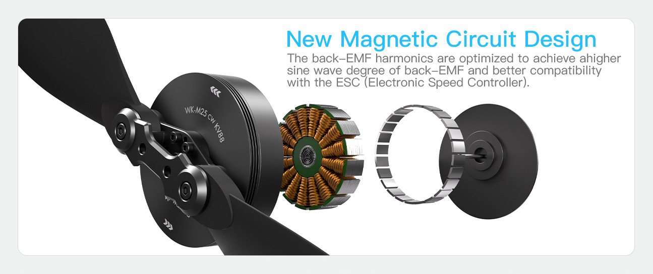 The WK-M25 power system adopts a highly modular integrated design, integrating the motor, ESC, propeller, carbon fiber tube, and motor base into a plug-and-play solution. It is extremely convenient for maintenance and disassembly, and compatible with 38 to 42-inch foldable propellers, effectively improving flight energy efficiency.